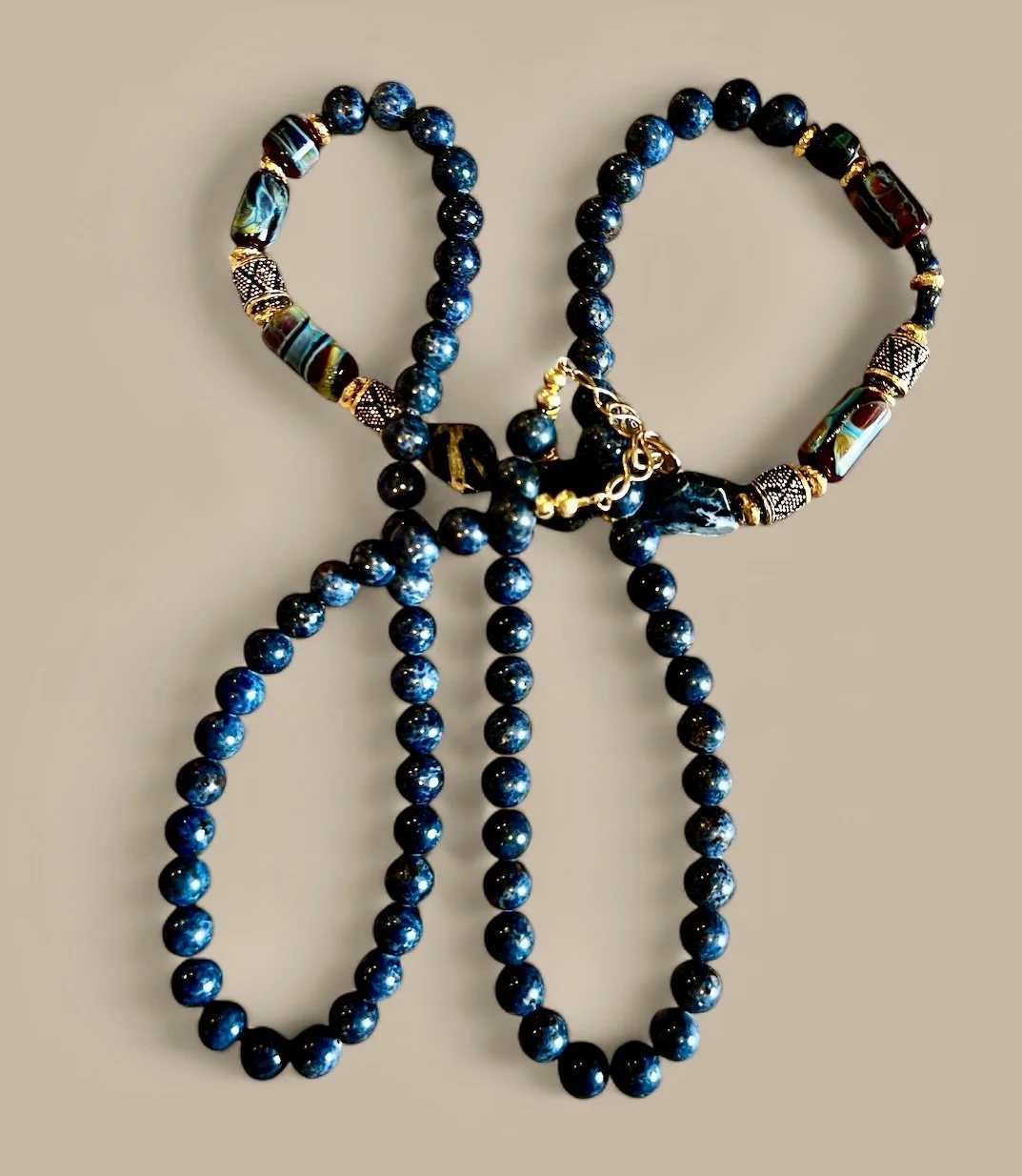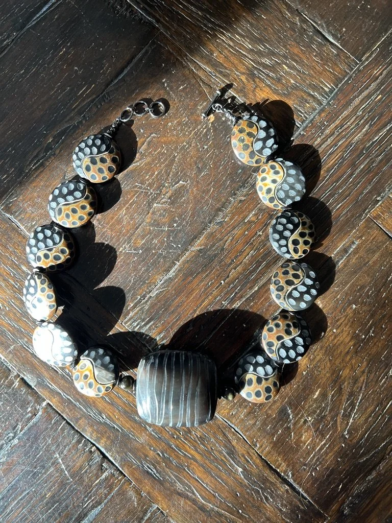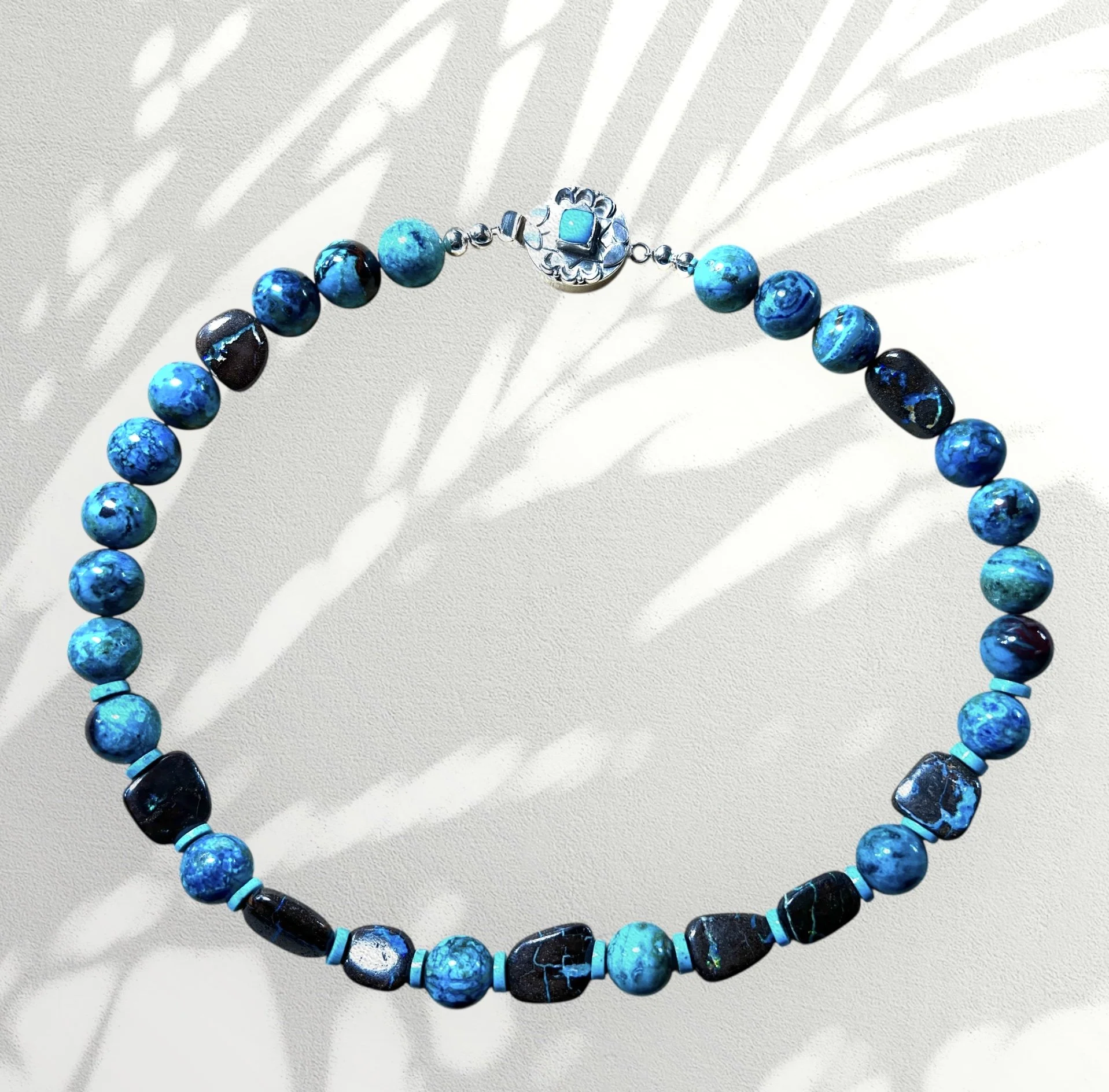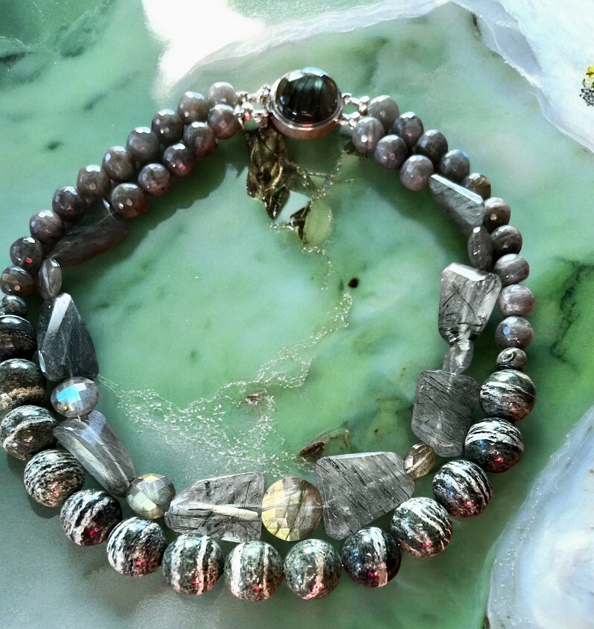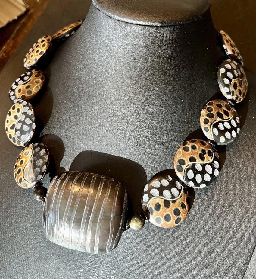 Categories: All Agate Crazy Lace Agate Montana Agate Web Agate Amazonite Amethyst Prasiolite Ametrine Aquamarine Azurite Beryl Bone Bronzite Caned Glass Carnelian Cat's Eye Chalcedony Chrysocolla Chariote Chrysoberyl Chrysophrase Multi-stone Citrine Coral Crystal Druzy Dumortierite Fordite Garnet Goshanite Hawk Eye Helidor Herkimer Diamond Iolite Kyanite Indigo Kyanite Jade Watermelon Jade Jadeite Lava Lodaliite Jasper Breciated Jasper Bruno Jasper Bumblebee jasper Cherry Creek Jasper Cocoa banded Jasper Crazy Lace Jasper Dragon Stone Jasper Ocean Jasper Picture Jasper Polychrome Jasper Tree Fern Jasper Wood Jasper Vintage black jasper Wild Horse Picture Jasper Labradorite Lapis Lazuli Larimar Larkivite Montana Agate Moonstone Muscovite Obsidian Golden Sheen Obsidian Snowflake Obsidian Onyx Opal Boulder Opal Koriot Opal Dendritic opal Ethiopian Opal Green Opal Pegmatite Peridot Pearls Peacock Pearl Phrenite Pietersite Quartz Crystal Quartz Rose Quartz Rutilated Quartz Mexican Fire Opals Spiderweb Quartz Strawberry Quartz Tangerine Quartz Rhodochrosite Ruby Sapphire Scorzalite Serpentine Septarian Smokey quartz Solar Quartz Sunstone Topaz Imperial Topaz Tektite Tourmaline Watermelon Tourmaline Indicolite Tourmaline Tiger Eye Tigereye/blue Tiger Iron Turquoise Ukanite White Buffalo Turquoise Shell South African Turban Shell Horn Wood Clasps Adjustable Clasp Push Clasp S clasp Convertible Lobster clasp CZ Lobster Clasp Fancy Toggle Bronze Toggle Copper toggle Gold filled Toggle Sterling Silver toggle clasp Vermeil Toggle Magnetic clasp Sterling Silver Clasp Choker Style Long length 14kt gold bead All | Agate | Web Agate | Amazonite | Amethyst | Ametrine | Aquamarine | Azurite | Beryl | Bone | Bronzite | Caned Glass | Carnelian | Cat's Eye | Chalcedony | Chrysocolla | Chariote | Chrysoberyl | Chrysophrase | Multi-stone | Citrine | Coral | Crystal | Druzy | Dumortierite | Fordite | Garnet | Goshanite | Hawk Eye | Helidor | Herkimer Diamond | Iolite | Kyanite | Jade | Jadeite | Lava | Lodaliite | Jasper | Labradorite | Lapis Lazuli | Larimar | Larkivite | Montana Agate | Moonstone | Muscovite | Obsidian | Onyx | Opal | Pegmatite | Peridot | Pearls | Phrenite | Pietersite | Quartz | Rhodochrosite | Ruby | Sapphire | Scorzalite | Serpentine | Septarian | Smokey quartz | Solar Quartz | Sunstone | Topaz | Tektite | Tourmaline | Tiger Eye | Tiger Iron | Turquoise | Ukanite | White Buffalo Turquoise | Shell | Horn | Wood | Clasps | Convertible | Lobster clasp | CZ Lobster Clasp | Fancy Toggle | Magnetic clasp | Sterling Silver Clasp | Choker Style | Long length | 14kt gold bead | Shattuckite, Boulder Opal and Turquoise Necklace with Sterling Silver and Turquoise Clasp Pink Pearl and Rose Quartz Necklace with Faceted Pink Tourmaline and Sterling Silver Clasp Water Buffalo Horn Necklace with Acob Horn Pendant Turkish Chalcedony and Moonstone Beaded Necklace Wood, Shell and Silver Necklace Sold Out Crystal Necklace Yellow Crazy Lace Agate Pendant, Picture and Wood Jasper Beaded Necklace Citrine Trillion Necklace Lapis Lazuli Flower Beaded Necklace Brown, Grey, Silver Moonstone, Web Quartz & Montana Agate Beaded Necklace Turquoise, Boulder Opal, Cream Lamp-Glass, Silver Beaded Necklace Sold Out Labradorite and Milky Quartz Necklace with Sterling Silver Clasp Matte Flower Lapis Necklace Golden Sheen Obsidian and Labradorite Necklace with Black Gold and CZ Lobster Clasp Polychrome and Green Brecciated Jasper Necklace with Sterling and Peridot Clasp Fordite, Onyx. labradorite, Red Jade, Wood, Sterling Silver Beaded Necklace. Watermelon Tourmaline and Tourmaline Beaded Necklace Rare Natural Scorzalite Spinel With Muscovite in Cobalt Blue Pegmatite and Pietersite Beaded Necklace Silverleaf Serpentine, Labradorite and Green Tourmalated Quartz Double Necklace with Labradorite Clasp Larimar Nugget and Carved Beaded Necklace with Turquoise and Sterling Silver Clasp Boulder Opal, Sapphire and Azurite/Chrysocolla Necklace with Sterling Silver and Boulder Opal Clasp Hawkeye and Labradorite Necklace with Sterling Silver and Labradorite Clasp Samarticus Shell, Lodolite and Opal Beaded Necklace with Sterling Silver, Tiger Eye and Shell Clasp. Green Opal and Tourmaline Beaded Necklace Chrysocolla , Moonstone Beaded Necklace with a Turquoise with Gold-Filled Findings and Bronze Toggle Strawberry Quartz and Ruby Beaded Necklace Sold Out Fancy Crystal Quartz, 24kt Gold and Garnet Beaded Necklace with Vermeil CZ Clasp Wood Cleo Sticks, Golden Sheen Sapphire and Sterling Silver Brecciated Japer Clasp Sold Out Fancy-cut Pink Opal Demilune and Morganite Beaded Necklace Rhyolite Rainforest Jasper Pendant Necklace Spiderweb Quartz and Bronzite Necklace with Bronze Curled Toggle Prasiolite and Amazonite Necklace with Sterling Silver Leaf Clasp Indigo Kyanite, Amazonite and Ultra Baroque Pearl Necklace with Sterling Silver Clasps Polychrome Jasper and Watermelon Pink Jade Necklace Double length Watermelon Quartz and Tourmaline Beaded Necklace with Copper Clasp Bronzite and Koroit Opal beaded Necklace Tangerine Quartz Faceted Bruno Jasper and Copper Rutilated Beaded Necklace Flashy Labradorite Faceted Necklaces Sold Out Rhodochrosite and Tourmaline Beaded Necklace with an Rhodochrosite Pendant Montana Agate Necklace with Sunburst Clasp Gold Leafed Chrysoprase Nugget Necklace with Carved Chrysoprase Center Bead Dendritic and Wild Horse Picture Jasper Beaded Necklace with Sterling Charm Stunning Cane Glass and Sunstone Beaded Necklace Vintage black jasper, Smokey Topaz, Wood, Lava Necklace Lapis Lazuli Beaded Necklace Sold Out Amethyst Necklace Aquamarine, Jadeite, Larimar and Indicolite Tourmaline Necklace Multi Color Fire Opal Plain Nugget Beads with Tree Fern Jasper Pendant Sold Out Cherry Creek Jasper, Amazonite and Dragon Skin Jasper Necklace Bumblebee Jasper, Opal and Quartz bead set in 18kt gold Pietersite and Sapphire Necklace with copper Toggle. Elegant Grey Freshwater Pearl Necklace Green Opal and Lodalite Phantom Quartz w