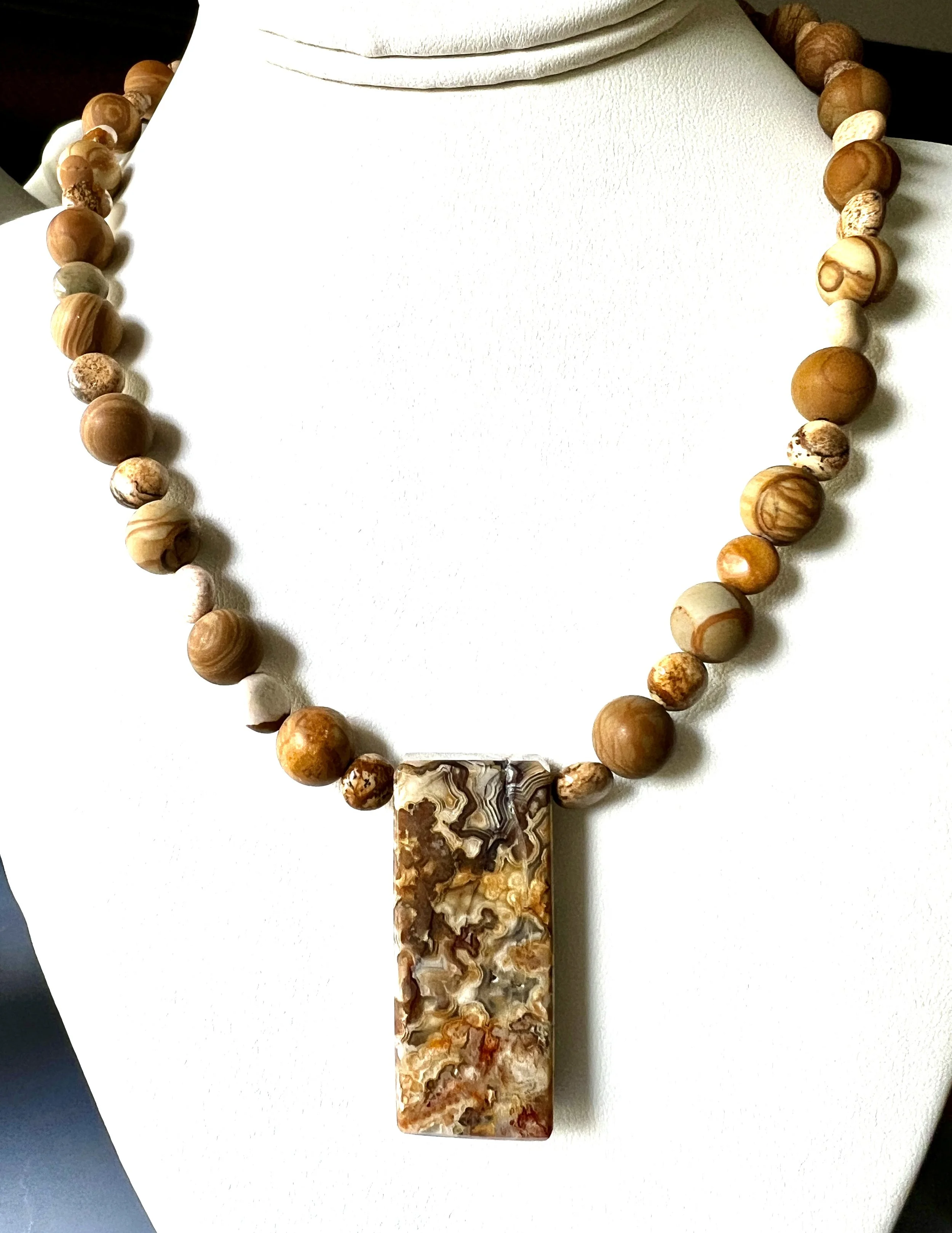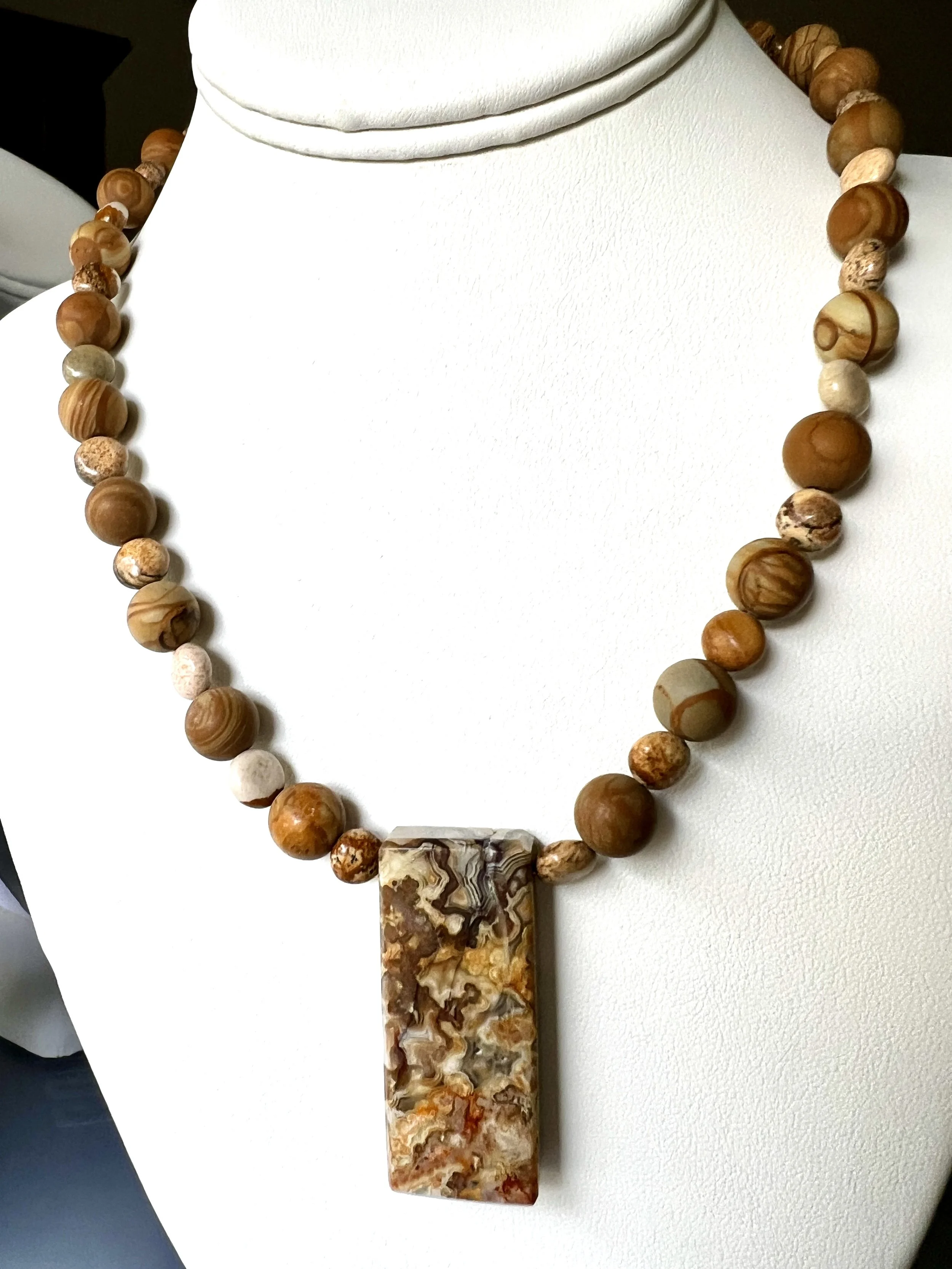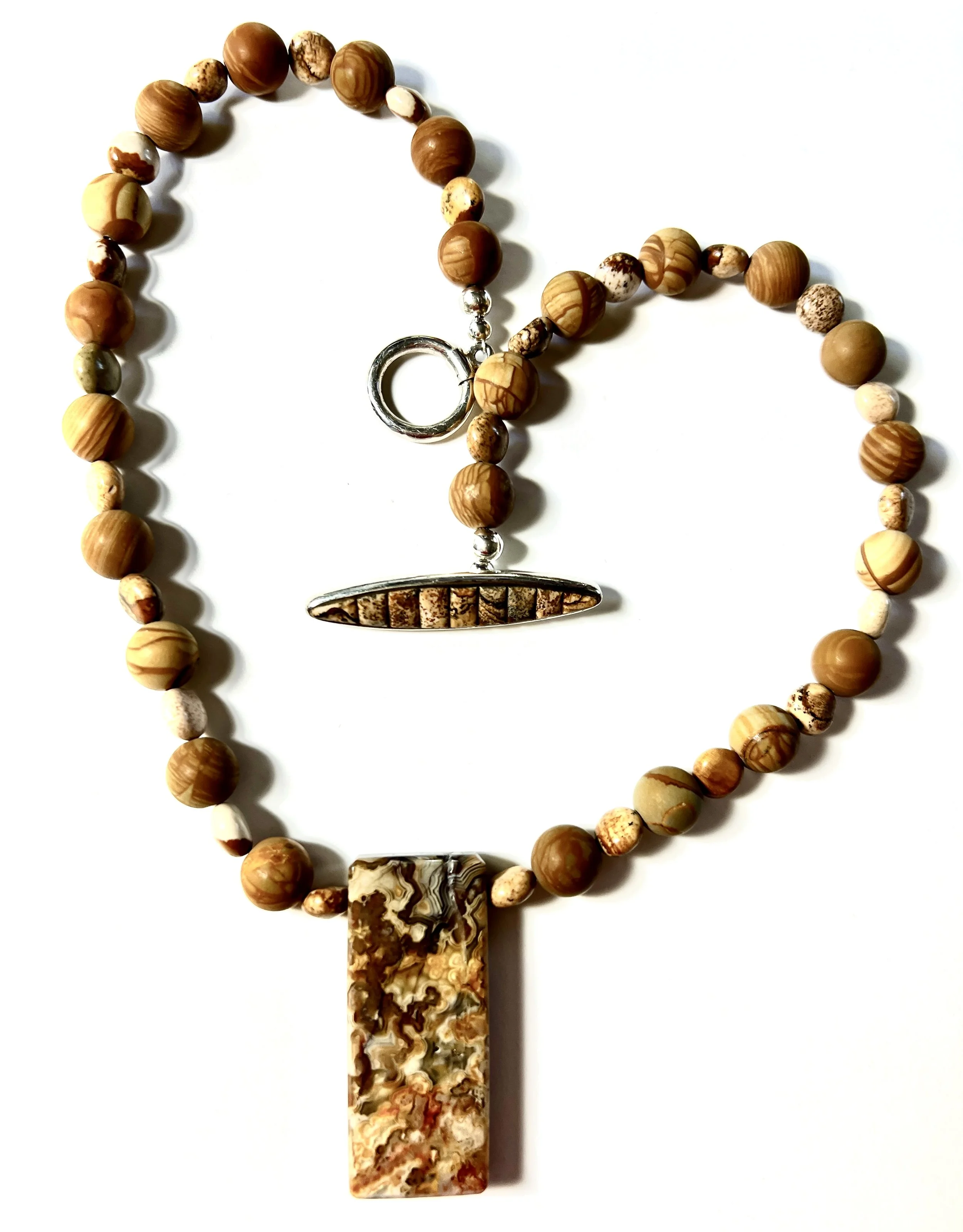 Double-sided Yellow Crazy Lace Pendant Necklace with Wood and Picture Jasper Beads and a Sterling Silver Toggle set with Picture Jasper.